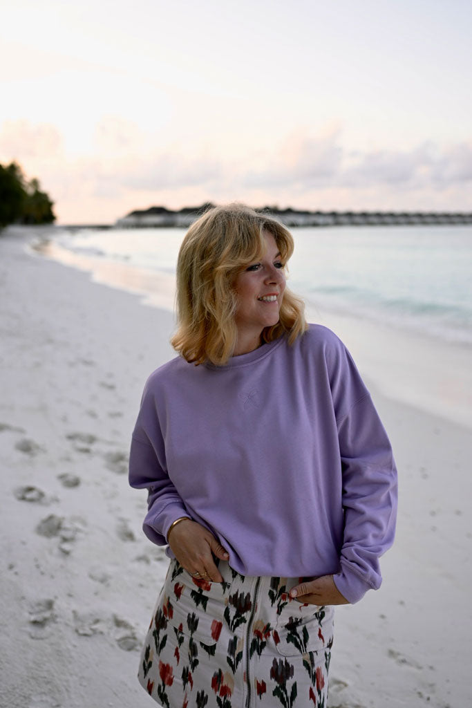 Der Emma sweater ist aus 100% Bio Baumwolle in Flieder gefertigt. Er hat einen lockeren Schnitt, leicht oversized Schnitt und eine kleine Schleife aufgestickt.