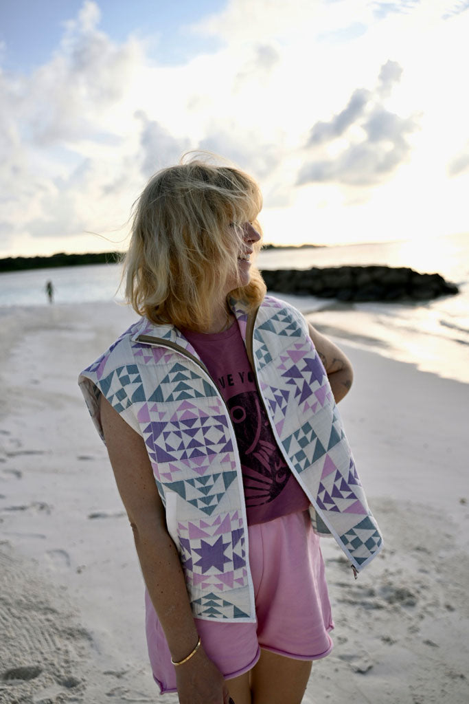 Die Linda Weste in Patchwork hat einen lockeren Schnitt und einen Stehkragen.